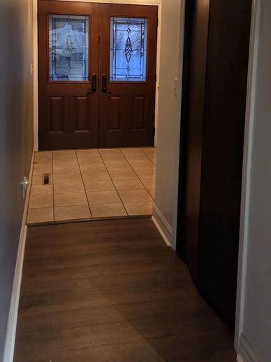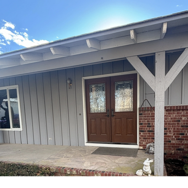 Large living room with carpet, beamed ceiling, brick wall and fireplace.
