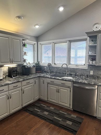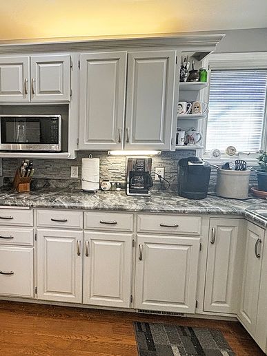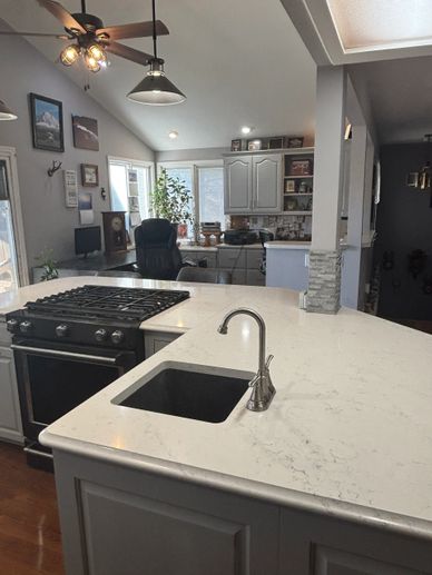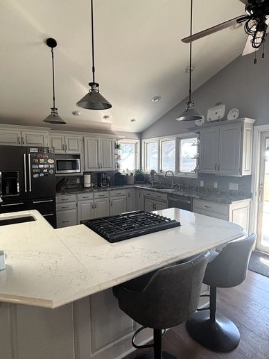Large, open kitchen with lots of counter space and custom-built cabinets.