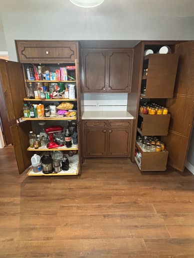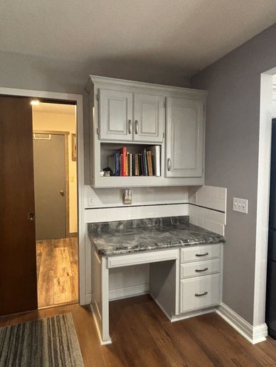 Built-in desk, cabinets and bookshelf. Pocket door to Utility Room.